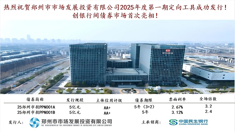 近日,鄭州市市場(chǎng)發(fā)展投資有限公司(以下簡(jiǎn)稱“鄭州市投”,外部主體評(píng)級(jí)AA+)成功發(fā)行2025年度第一期定向債務(wù)融資工具,進(jìn)一步優(yōu)化了公司融資結(jié)構(gòu)。本期債券由民生銀行擔(dān)任主承銷商,發(fā)行總規(guī)模10億元,創(chuàng)新采用“3+2年”(票面利率2.67%)與“5年”(票面利率3.12%)雙期限結(jié)構(gòu),創(chuàng)下近期同期限、同評(píng)級(jí)企業(yè)信用債首發(fā)利率較低水平,顯示出資本市場(chǎng)對(duì)鄭州國企發(fā)展前景的高度認(rèn)可。